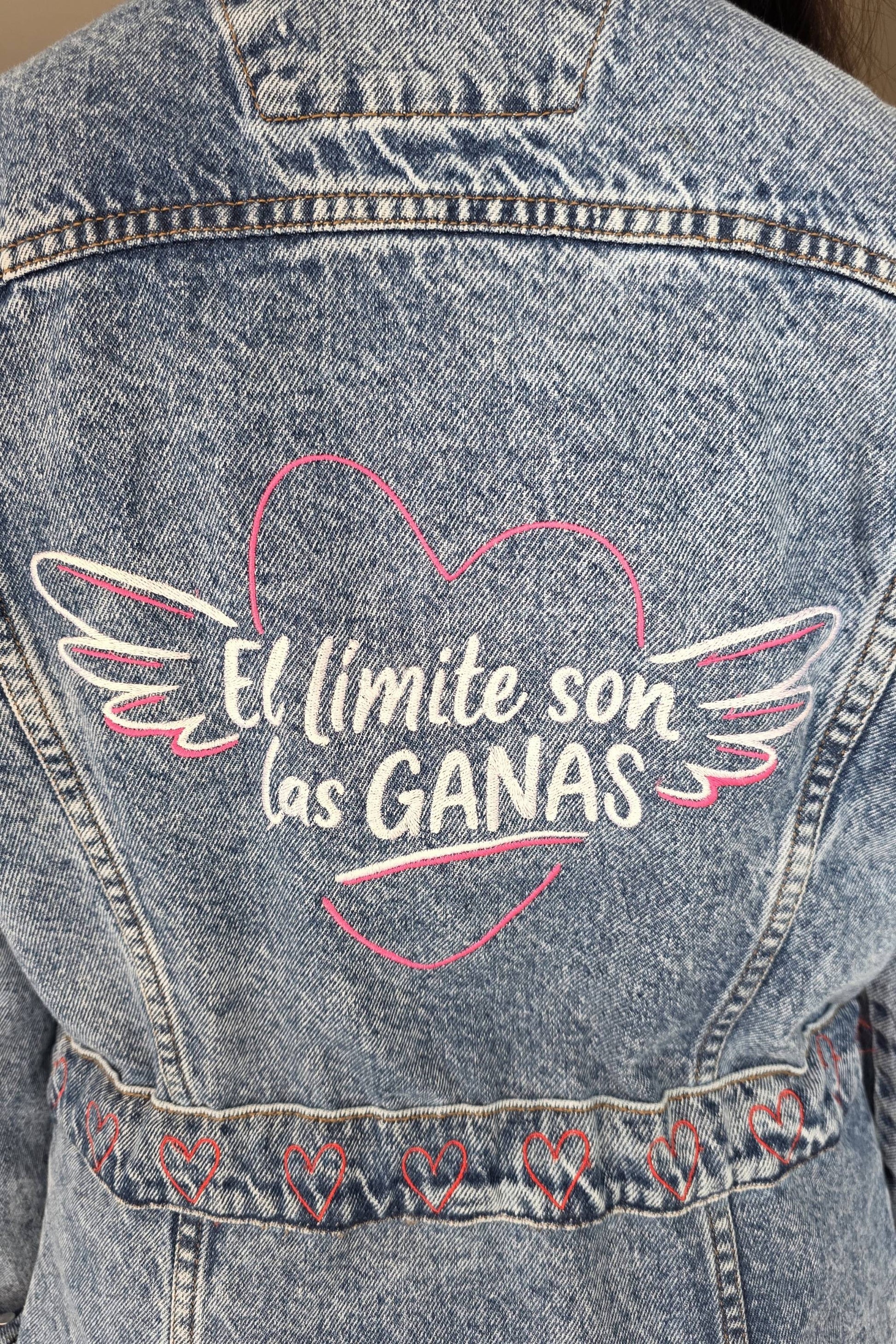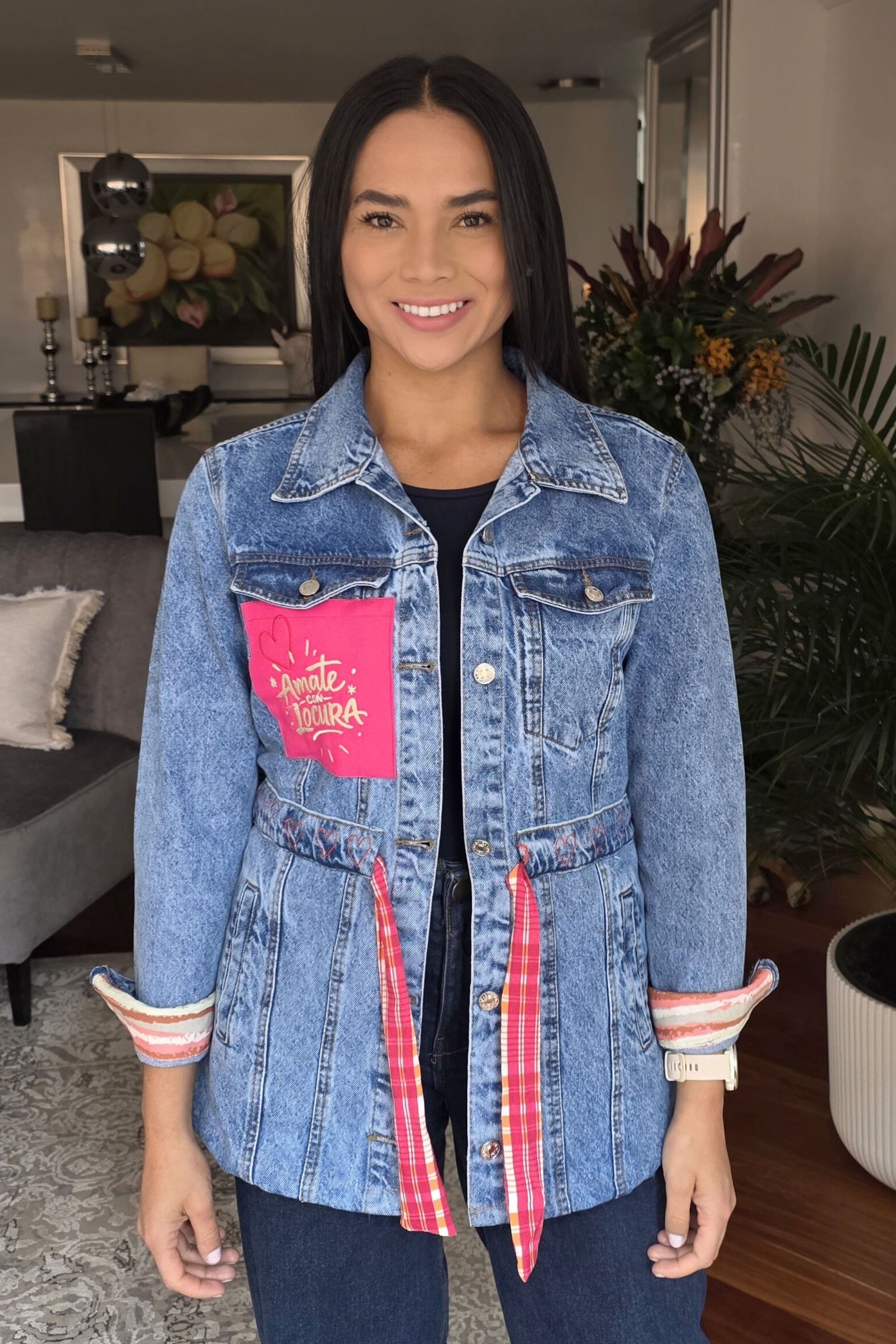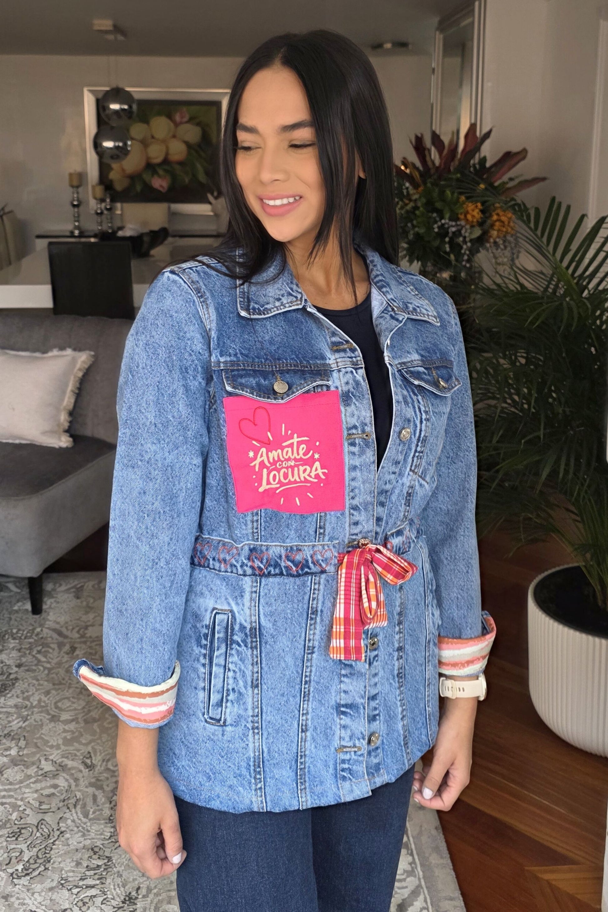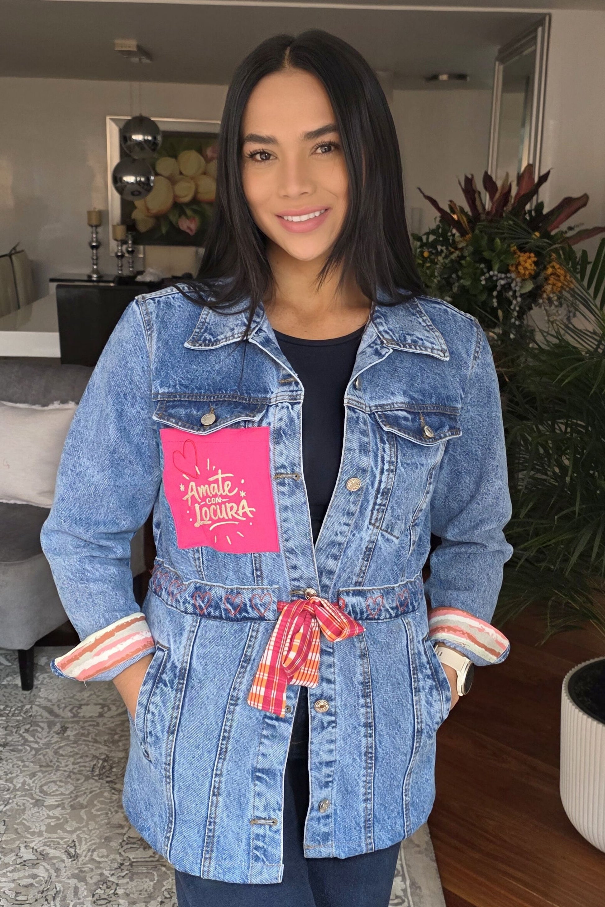 Chaqueta en denim 100 % algodón Colombiano con un bordados de corazones y una frase que dice amate con locura