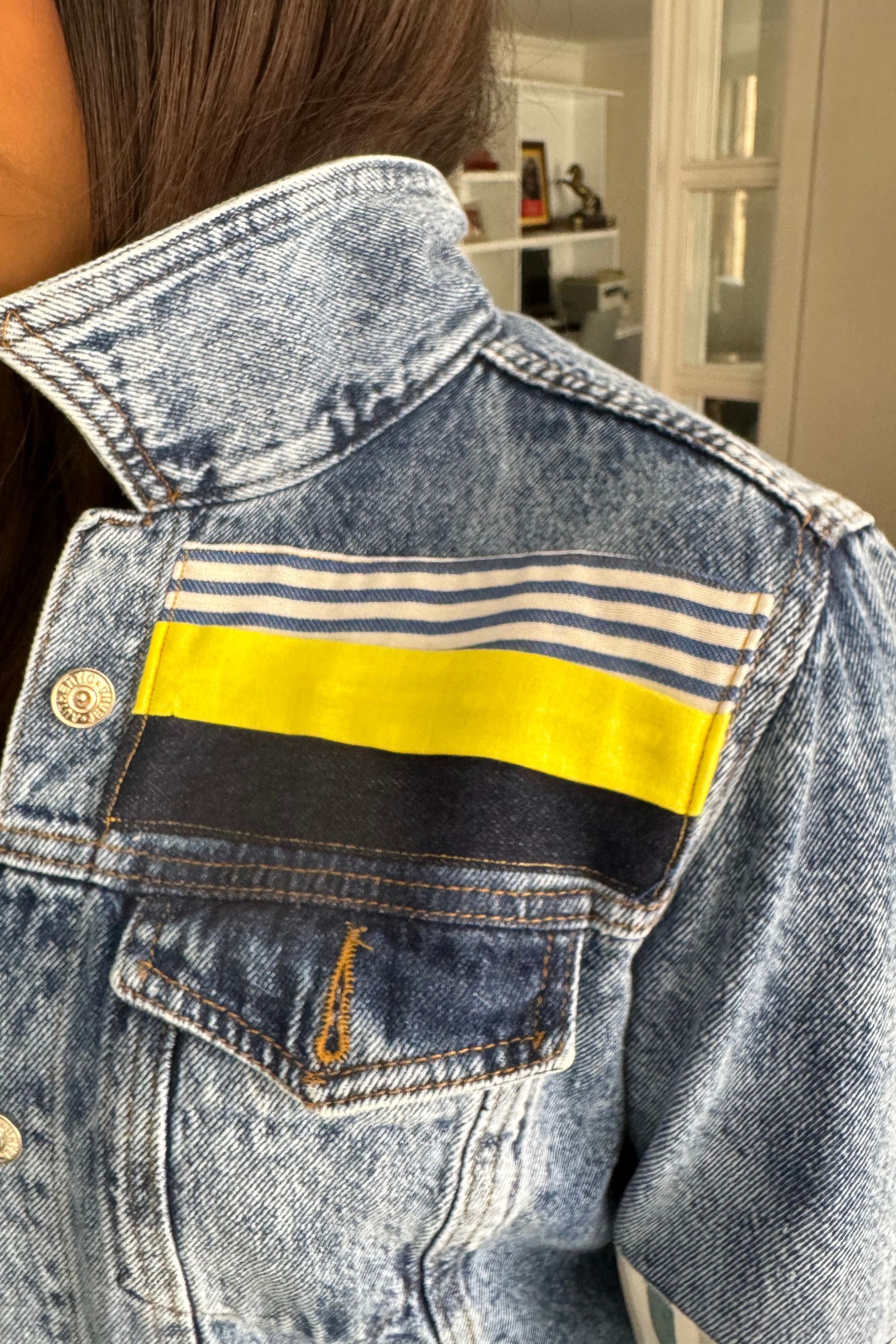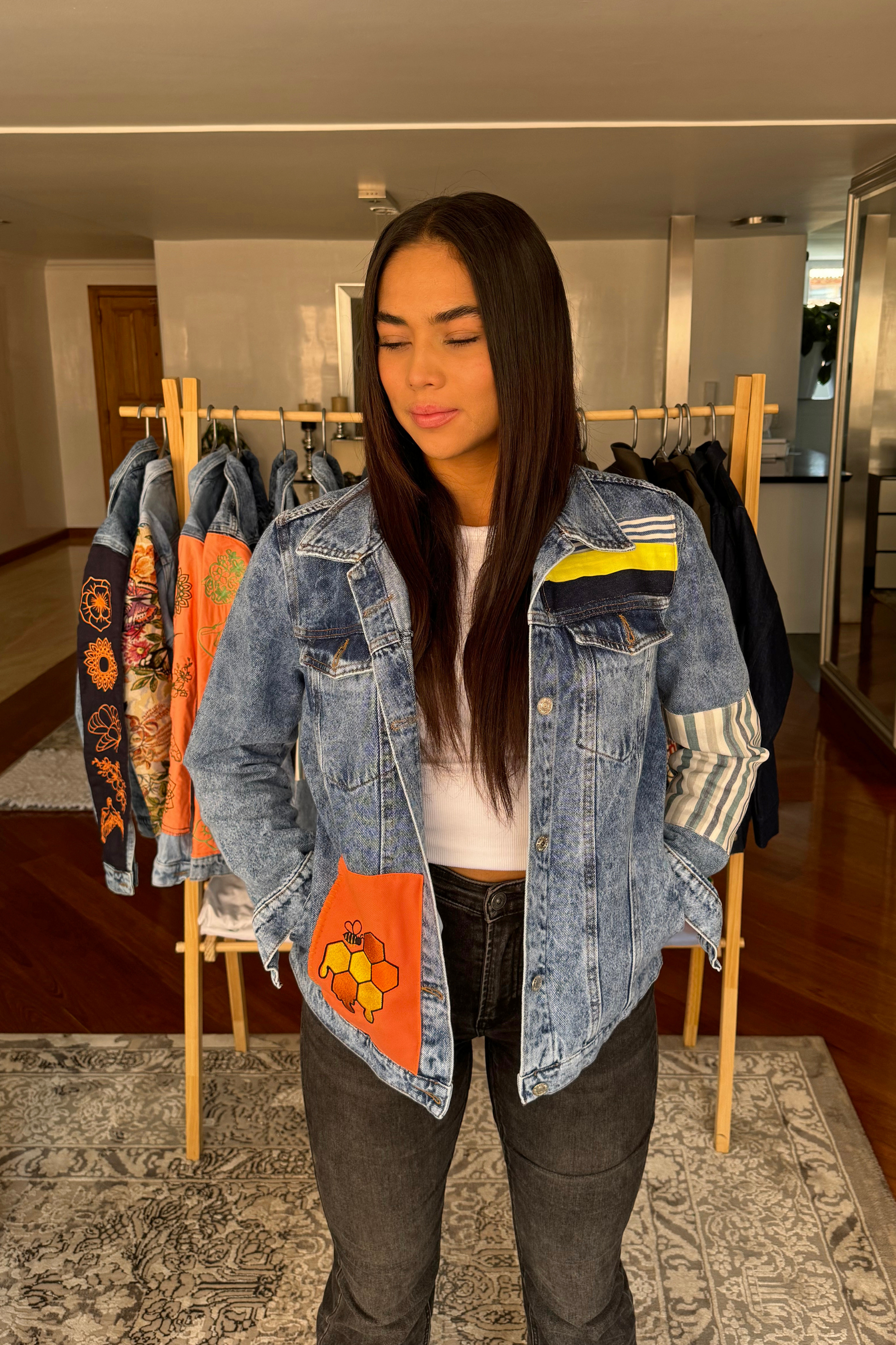 Esta chaqueta de denim presenta un bordado espectacular que destaca una abeja rodeada de flores coloridas y hexágonos dorados que representan la dulzura de la miel.