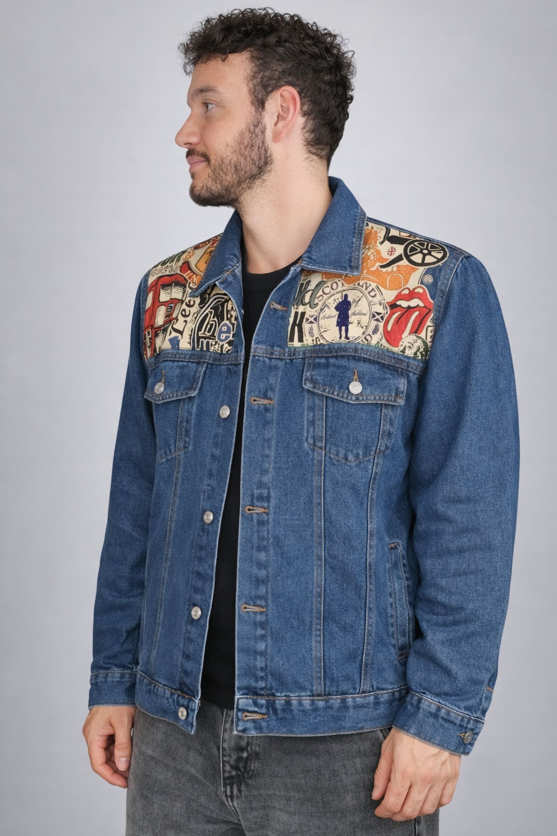 Chaqueta CLÁSICA HOMBRE hecha en denim de alta calidad, combinada con una tela tejida en Colombia con motivo LONDRES, diseños exclusivos!