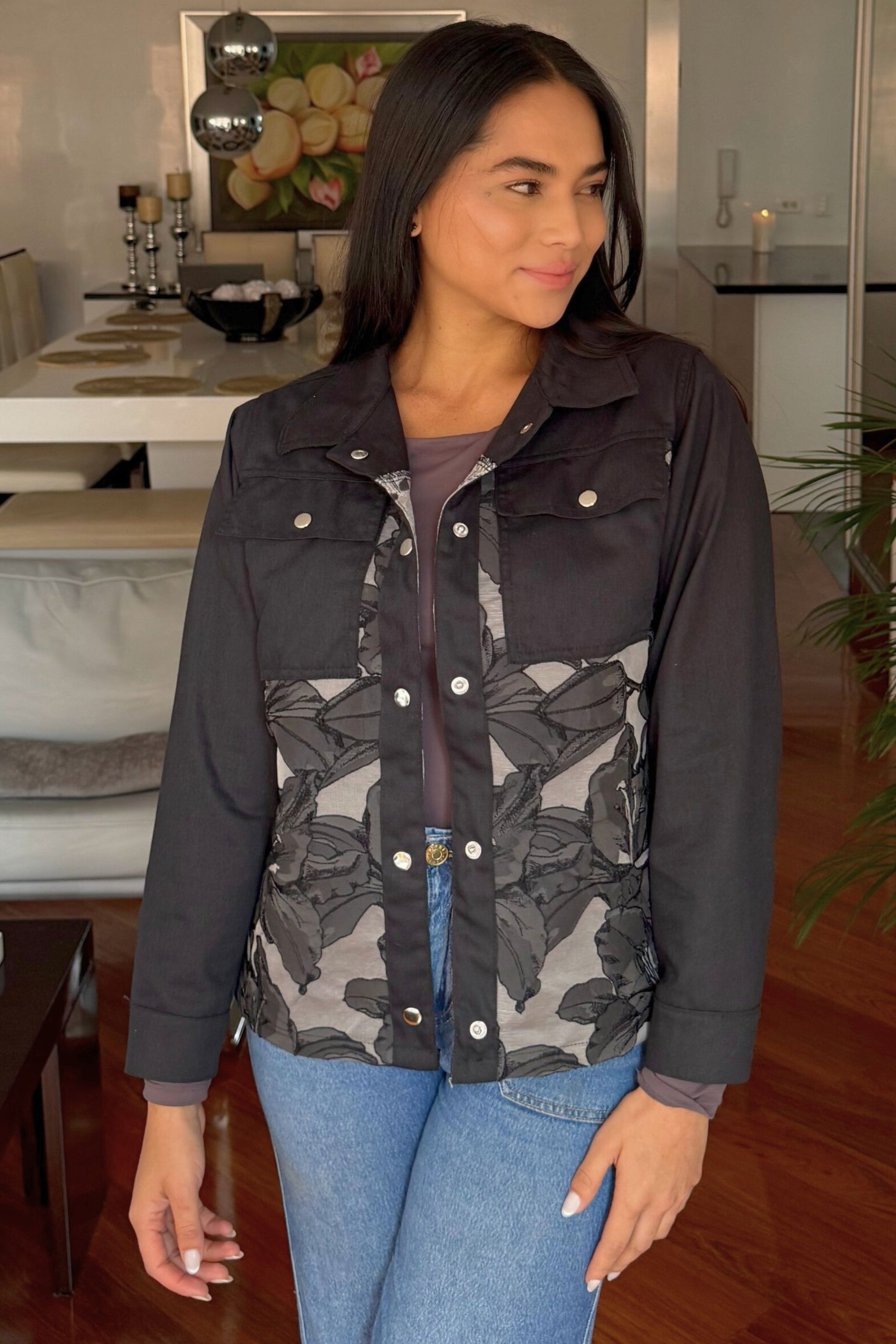 Chaqueta estilo oversize con un elegante panel de textura DE ORQUIDEAS ideal para quienes buscan un look sofisticado sin sacrificar comodidad.